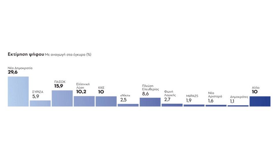 Στη δημοσκόπηση, που δημοσιεύει η εφημερίδα «Παραπολιτικά», η ΝΔ συγκεντρώνει 23,8%, ενώ ενισχυμένο εμφανίζεται το ΠΑΣΟΚ. Την ίδια ώρα, διευρύνεται το ποσοστό των αναποφάσιστων.