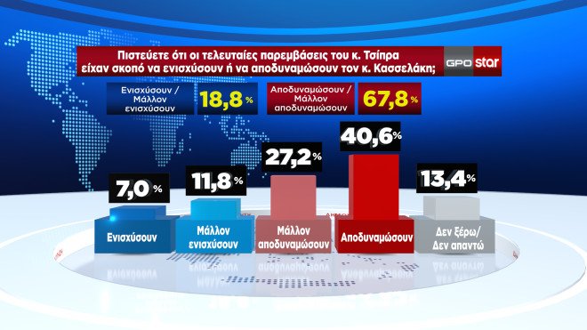 Το 67,8% των πολιτών θεωρεί ότι οι τελευταίες παρεμβάσεις του Αλέξη Τσίπρα είχαν σκοπό να «αποδυναμώσουν» και «μάλλον αποδυναμώσουν» τον Στ. Κασσελάκη.