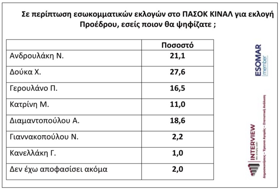 Δημοσκόπηση της Interview για την «Political» αναφορικά με τις εσωκομματικές εκλογές στο ΠΑΣΟΚ για νέο αρχηγό δίνει προβάδισμα στον Χάρη Δούκα έναντι του Νίκου Ανδρουλάκη.