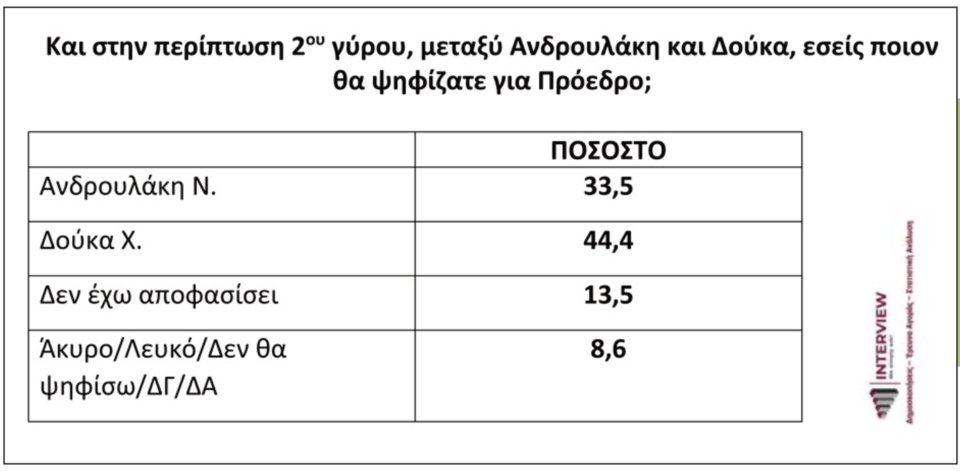Στο ερώτημα «Στην περίπτωση δεύτερου γύρου μεταξύ Ανδρουλάκη και Δούκα, εσείς ποιον θα ψηφίζατε για πρόεδρο;», προηγείται ο Χάρης Δούκας με ποσοστό 44,4%, με τον Νίκο Ανδρουλάκη να βρίσκεται δέκα μονάδες πίσω, στο 33,5%. Στο 13,5% είναι το ποσοστό των αναποφάσιστων.