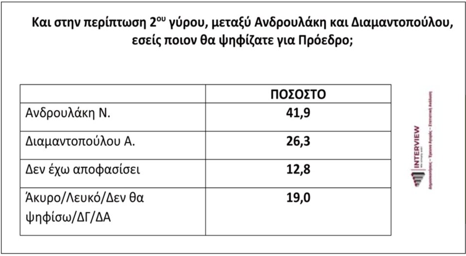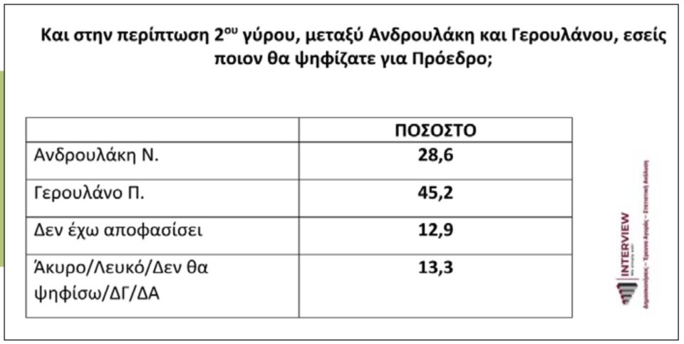 Στο 2ο σενάριο που δίνει η Interview ο Νίκος Ανδρουλάκης χάνει από τον Παύλο Γερουλάνο, ο οποίος πιάνει 45,2%, αφήνοντας πίσω τον κ. Ανδρουλάκη στο 28,6%, με τους αναποφάσιστους στο 12,9%.