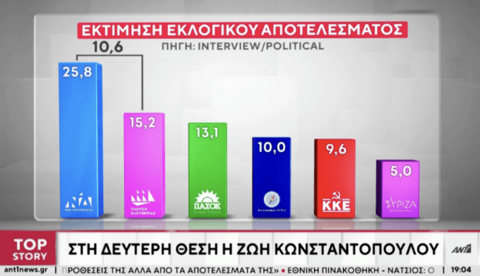 Το κυβερνών κόμμα συγκεντρώνει 25,8% και ακολουθεί η Πλεύση Ελευθερίας της Ζωής Κωνσταντοπούλου με 15,2%.
