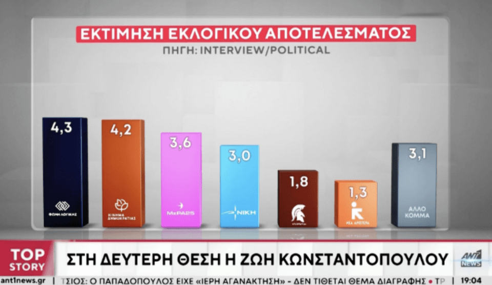 Η Ελληνική Λύση συγκεντρώνει 10%, το ΚΚΕ 9,6%, ενώ ο ΣΥΡΙΖΑ σημειώνει σημαντική πτώση, περιοριζόμενος στο 5%.
