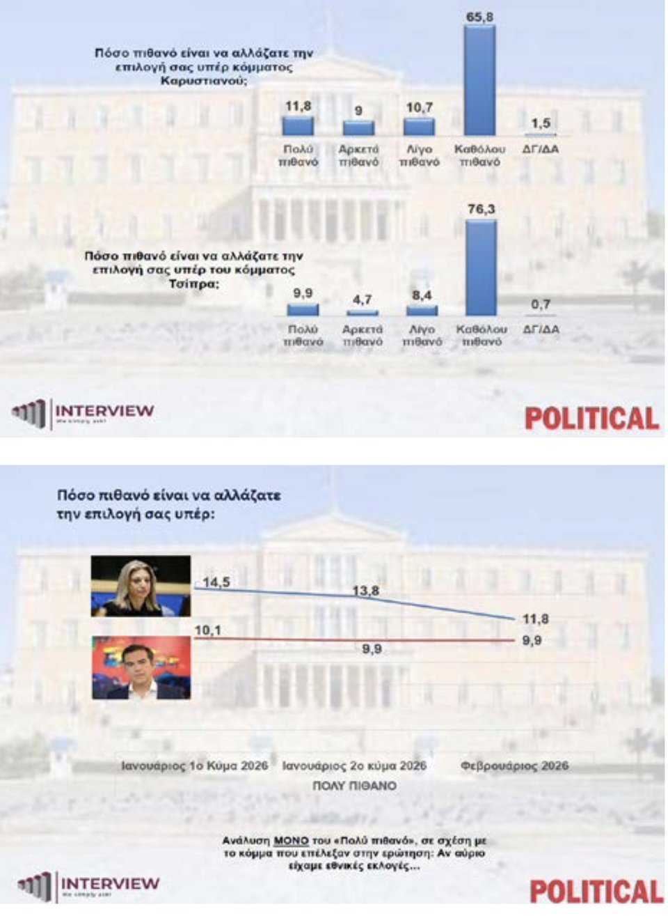 Στη δημοσκόπηση ανιχνεύονται οι τάσεις σε ό,τι αφορά την πιθανότητα να αλλάξουν οι πολίτες την επιλογή τους υπέρ ενός κόμματος από τη Μαρία Καρυστιανού ή από τον Αλέξη Τσίπρα. Ειδικότερα, στην ερώτηση «Πόσο πιθανό είναι να αλλάζατε την επιλογή σας υπέρ κόμματος Καρυστιανού;», το 11,8% απαντά πολύ πιθανό, το 9% αρκετά πιθανό, το 10,7% λίγο πιθανό, το 65,8% καθόλου πιθανό, ενώ 1,5% απαντά ΔΞ/ΔΑ.