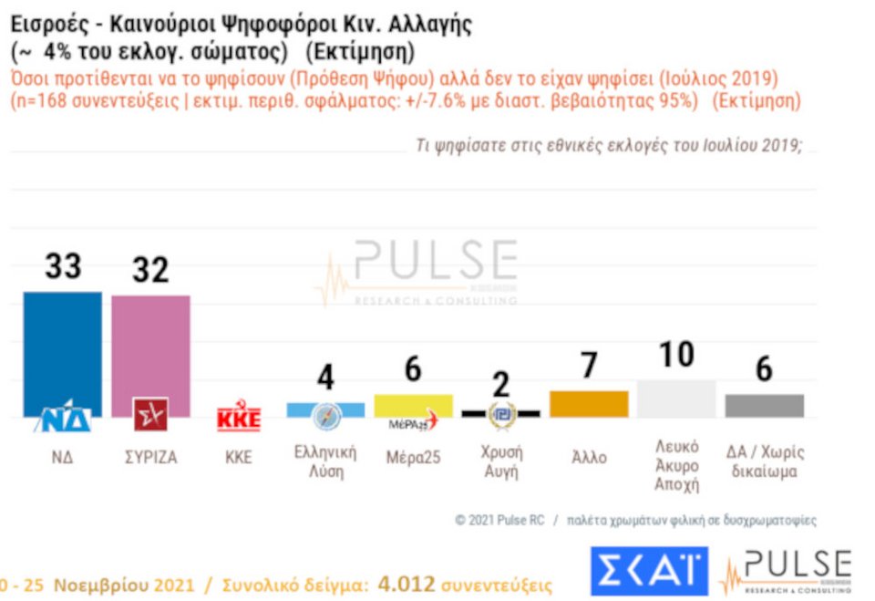 Οπως προκύπτει από τη δημοσκόπηση της Pulse, στα ανεβασμένα ποσοστά του ΚΙΝΑΛ, οι εισροές νέων ψηφοφόρων στο Κίνημα Αλλαγής προέρχονται σχεδόν ισόποσα από ΝΔ (33%) και ΣΥΡΙΖΑ (32%).