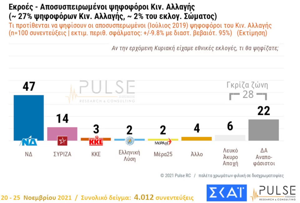 Υπενθυμίζεται ότι το ΚΙΝΑΛ τόσο στη μέτρηση της Pulse χθες, όσο και στην έρευνα της Metron εμφανίζεται με ιδιαίτερα ανεβασμένα ποσοστά (10% με αναγωγή στην έρευνα της Pulse, 9,6% στη δημοσκόπηση της Metron).