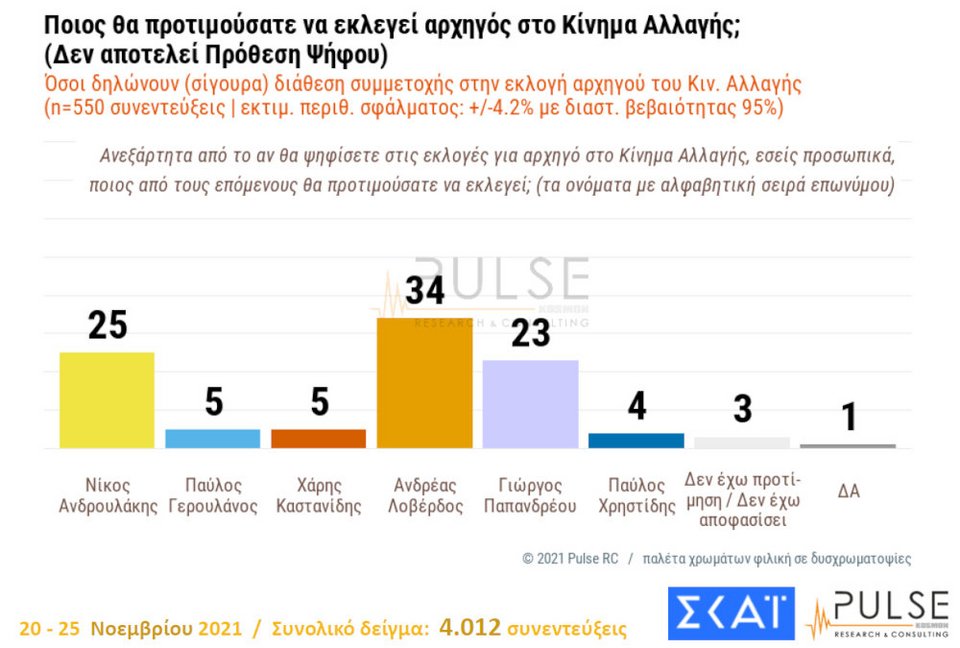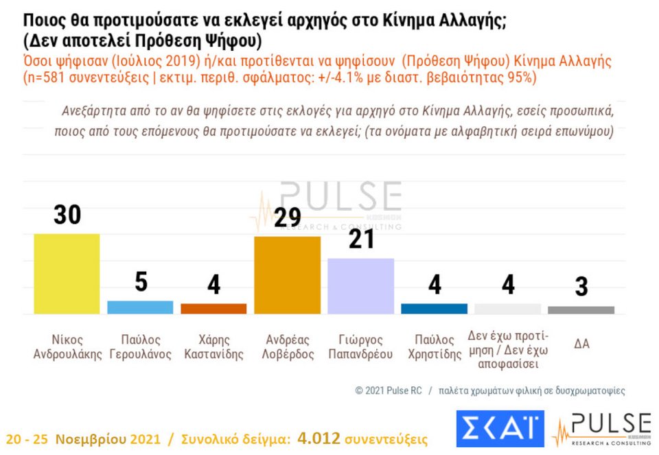 Διαφορετικά είναι τα ποσοστά για το ίδιο ερώτημα, για όσους ψήφισαν το ΚΙΝΑΛ τον Ιούλιο του 2019 ή/και προτίθενται να ψηφίσουν Κίνημα Αλλαγής στις επόμενες εκλογές. Εδώ προηγείται οριακά με 30% ο Νίκος Ανδρουλάκης, σε απόσταση μιας μονάδας ακολουθεί ο Ανδρέας Λοβέρδος (29%) και έπεται ο Γιώργος Παπανδρέου (21%). Ακολουθούν ο Παύλος Γερουλάνος με 5% και από 4% συγκεντρώνουν οι Χάρης Καστανίδης και Παύλος Χρηστίδης.