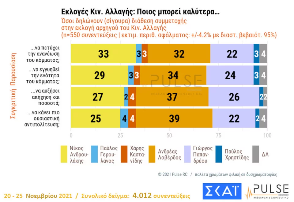 Ο Νίκος Ανδρουλάκης προτιμάται από όσους θα συμμετάσχουν στην εκλογική διαδικασία και στο ερώτημα «Ποιος μπορεί καλύτερα να πετύχει την ανανέωση του κόμματος», ο Ανδρέας Λοβέρδος στο ερώτημα «ποιος μπορεί να εγγυηθεί την ενότητα του κόμματος», όπως και στα ερωτήματα «ποιος μπορεί να αυξήσει απήχηση και ποσοστά» και «ποιος μπορεί να κάνει πιο ουσιαστική αντιπολίτευση».