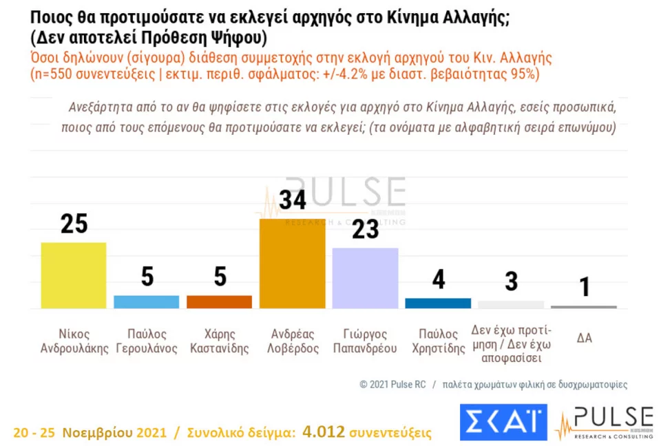Στο ερώτημα «Ποιος θα προτιμούσατε να εκλεγεί αρχηγός στο ΚΙΝΑΛ» (που δεν αποτελεί πρόθεση ψήφου) από όσους θα συμμετάσχουν «σίγουρα» στις εσωκομματικές εκλογές, προηγείται ο Ανδρέας Λοβέρδος με 34%, ακολουθεί ο Νίκος Ανδρουλάκης με 25%, ο Γιώργος Παπανδρέου με 23%, από 5% οι Παύλος Γερουλάνος και Χάρης Καστανίδης και με 4% ο Παύλος Χρηστίδης.