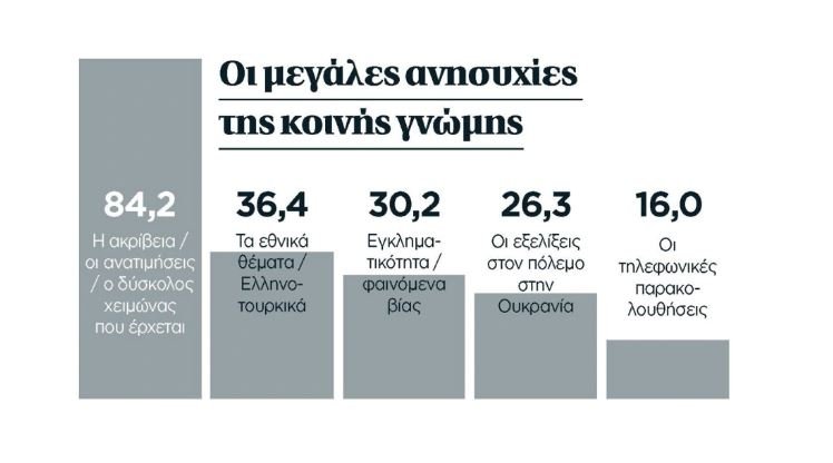 Σύμφωνα με την δημοσκόπηση της Marc οι πολίτες ενδιαφέρονται για τα προβλήματα της καθημερινότητας με το 84,2% να ανησυχεί για το κύμα ακρίβειας, και όχι για τις τηλεφωνικές παρακολουθήσεις. Επίσης, τα εθνικά θέματα και οι τουρκικές προκλήσεις ανησυχούν το 36,4% των πολιτών, η εγκληματικότητα και τα φαινόμενα βίας το 30,2% των πολιτών, οι εξελίξεις στον πόλεμο της Ουκρανίας το 26,3% των πολιτών, και μόνον το 16% δείχνει να ενδιαφέρεται και να ανησυχεί για τις τηλεφωνικές παρακολουθήσεις.