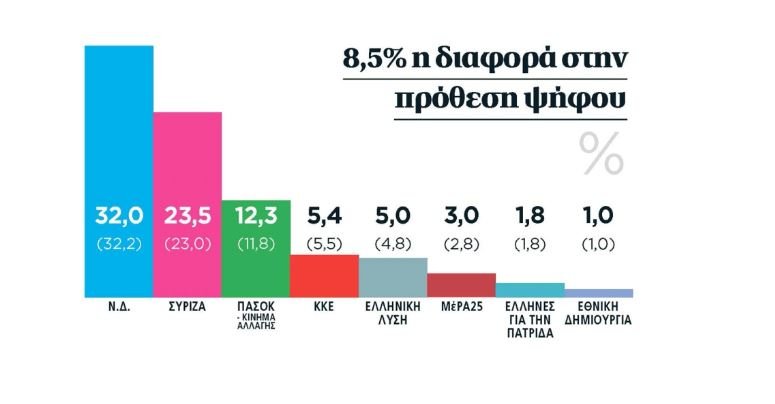 Σύμφωνα με τα πρώτα στοιχεία που δημοσιεύονται στην ιστοσελίδα Πρώτο Θέμα, η ΝΔ καταγράφει μια διαφορά στην πρόθεση ψήφου της τάξης του 8,5%, ενώ ο ΣΥΡΙΖΑ και το ΠΑΣΟΚ - ΚΙΝΑΛ κερδίζουν ένα 0,5% σε σχέση με την προηγούμενη δημοσκόπηση.
