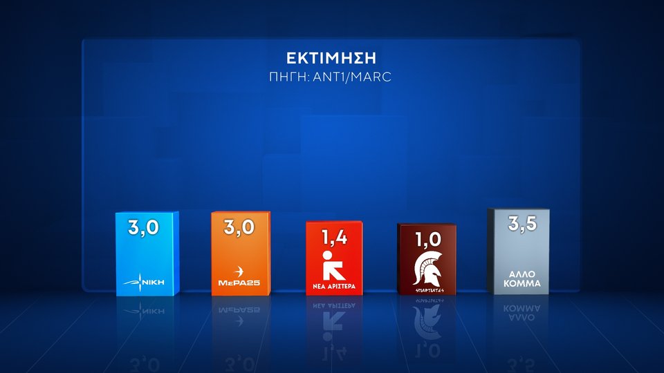 Οριακά εντός με 3% είναι και η Νίκη με το ΜέΡΑ25, ενώ εκτός Βουλής φαίνονται η Νέα Αριστερά και οι Σπαρτιάτες.