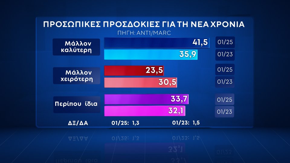 Σε προσωπικό επίπεδο, το 41,5% θεωρεί ότι τα πράγματα θα πάνε καλύτερα, ενώ μόλις 1 στους 4 θεωρεί πως θα γίνουν χειρότερα φέτος τα πράγματα.