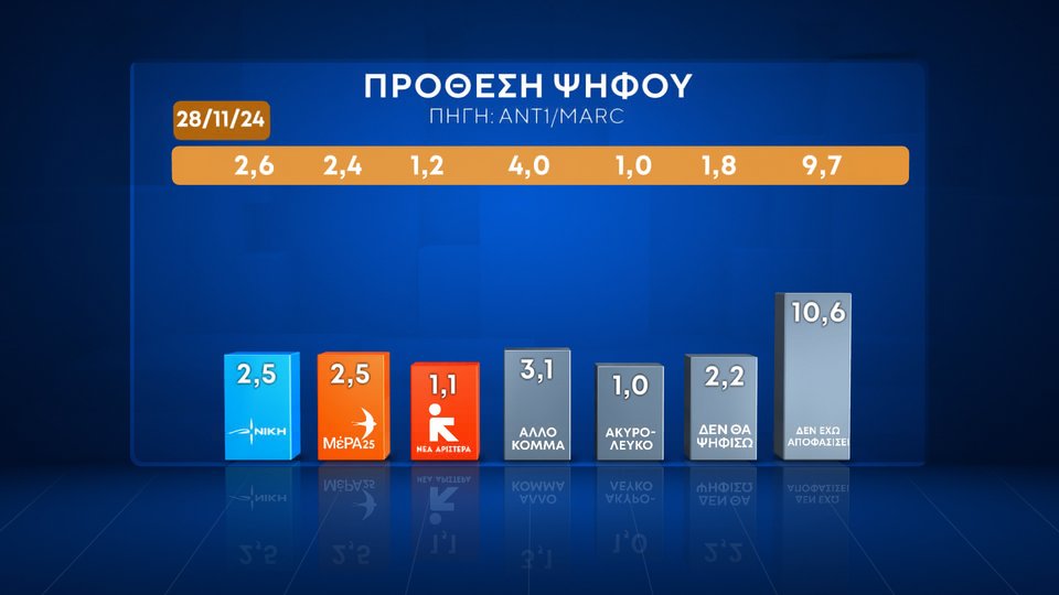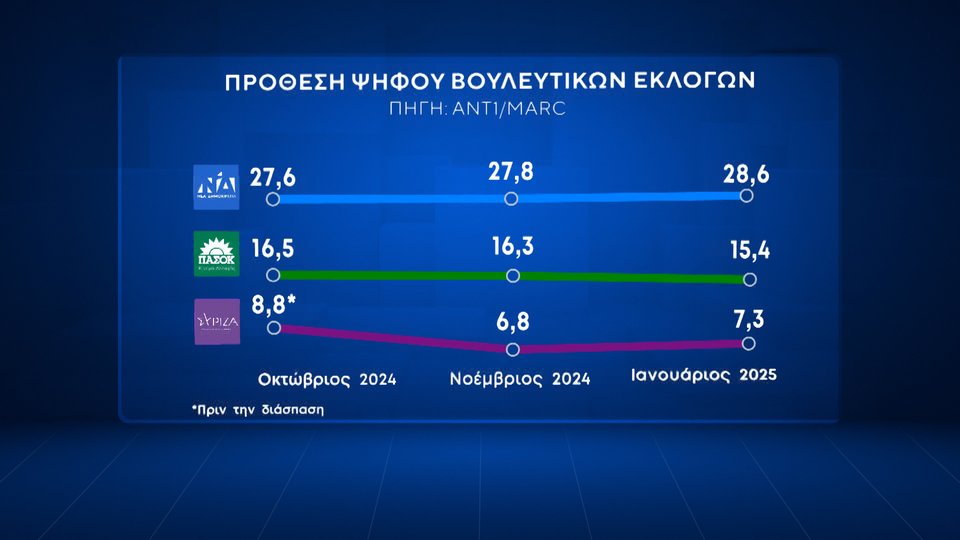Προβάδισμα 13,4 μονάδων ως προς την εκτίμηση ψήφου στη ΝΔ δίνει το πρώτο μέρος της δημοσκόπησης της MARC για τον ΑΝΤ1.