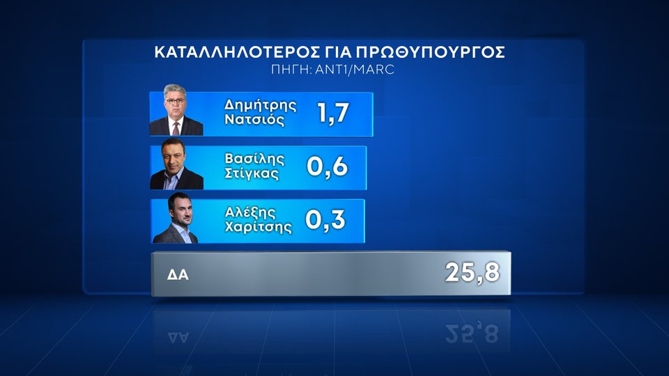 Για τους πολιτικούς αρχηγούς, καταλληλότερος για πρωθυπουργός είναι ο Κυριάκος Μητσοτάκης με 33,9%, ενώ ακολουθεί ο Νίκος Ανδρουλάκης με 9,5% και ο Κυριάκος Βελόπουλος είναι τρίτος με 5%.