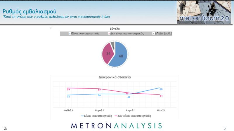 Ικανοποιημένοι είναι 6 στους 10 ερωτηθέντες από τον ρυθμό εμβολιασμού στη χώρα μας, έναντι 34% που δηλώνει το αντίθετο.