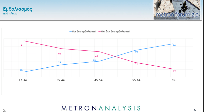 Τα στοιχεία ανά ηλικία εμβολιασμού στην ίδια δημοσκόπηση δείχνουν εντυπωσιακή ανταπόκριση στις ηλικίες 50-76 ετών.