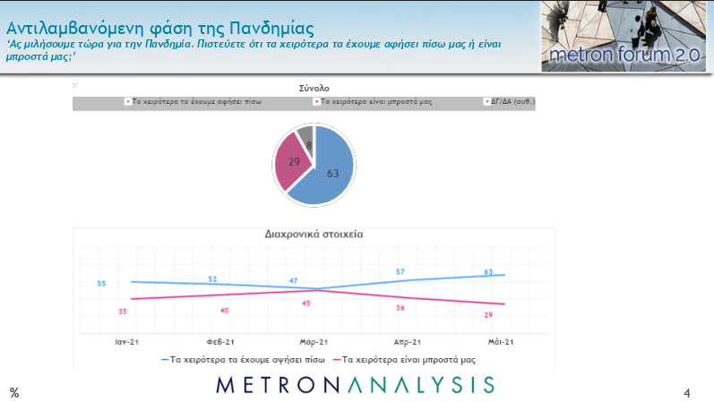 Επίσης, οι ερωτηθέντες είναι αισιόδοξοι για την πορεία της πανδημίας, καθώς το 63% πιστεύει ότι έχουμε αφήσει πίσω μας τα χειρότερα, έναντι 29% που είναι απαισιόδοξοι.