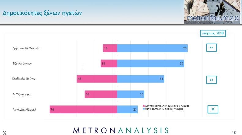 Ενδιαφέρον παρουσιάζουν οι απαντήσεις των ερωτηθέντων για σημαντικούς ξένους ηγέτες. Ο πλέον δημοφιλής είναι ο Γάλλος πρόεδρος Εμανουέλ Μακρόν με 79% θετικές ψήφους. Ακολουθεί σε απόσταση αναπνοής με 75% ο Αμερικανός πρόεδρος Τζο Μπάιντεν. Τρίτος ο Ρώσος πρόεδρος Βλαντίμιρ Πούτιν με 53% θετικές και 45% αρνητικές γνώμες. Τελευταία είναι η Γερμανίδα καγκελάριος Ανγκελα Μέρκελ, με 76% αρνητικές γνώμες στη χώρα μας και 23% θετικές.