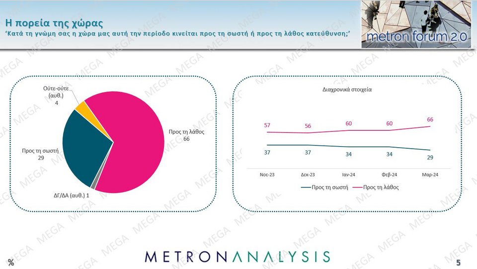 Η δημοσκόπηση αποτυπώνει τη δυσαρέσκεια των πολιτών σχετικά με την πορεία της χώρας, καθώς οι ερωτηθέντες εκτιμούν κατά 66% ότι πάει προς τη λάθος κατεύθυνση, ενώ το 29% κρίνει προς τη σωστή.