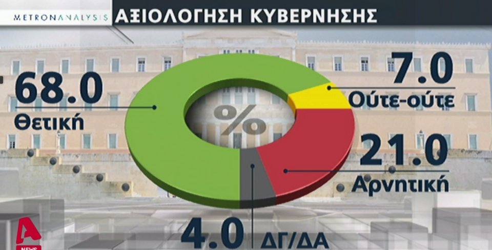 Σύμφωνα με τη «Metron Analysis», το 68% κρίνει ως θετική την αξιολόγηση της κυβέρνησης, το 21% ως αρνητική και το 6% ούτε θετική, ούτε αρνητική.