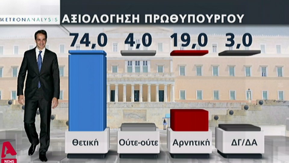 Θετική είναι η αποτίμηση των πολιτών για τις πρώτες 60 ημέρες της κυβέρνησης Μητσοτάκη, σύμφωνα με δημοσκόπηση της Metron Analysis για τον τηλεοπτικό σταθμό Alpha.