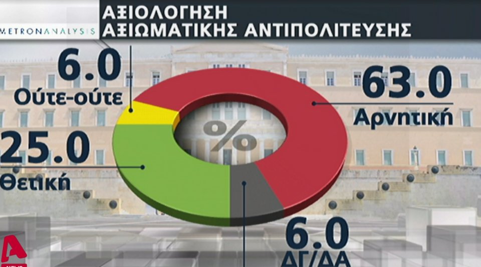 Ως προς τον ΣΥΡΙΖΑ το 63% των ερωτηθέντων τον κρίνουν αρνητικά ως αξιωματική αντιπολίτευση, το 25% θετικά ενώ 6% απαντούν Ούτε θετικά ούτε αρνητικά.