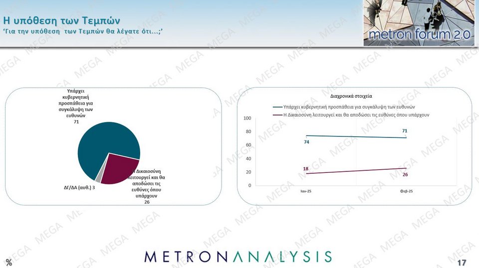 Σε ερώτημα «Για την υπόθεση των Τεμπών θα λέγατε ότι…», το 71% απαντά «υπάρχει κυβερνητική προσπάθεια για συγκάλυψη των ευθυνών» και το 26% λέει «Η Δικαιοσύνη λειτουργεί και θα αποδώσει τις ευθύνες όπου υπάρχουν».