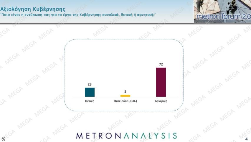 Στην αξιολόγηση της κυβέρνησης, το 23% βλέπει θετικό το έργο της, ενώ 7 στους 10 έχουν αντίθετη άποψη. Σε αντίστοιχα επίπεδα κινείται η αξιολόγηση του έργου του πρωθυπουργού.