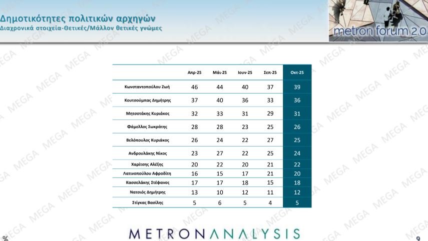 Στη δημοτικότητα των πολιτικών αρχηγών, ωστόσο, η Ζωή Κωνσταντοπούλου είναι στο 39%, ακολουθούμενη από τον Δημήτρη Κουτσούμπα (36%) και τον Κυριάκο Μητσοτάκη (31%).