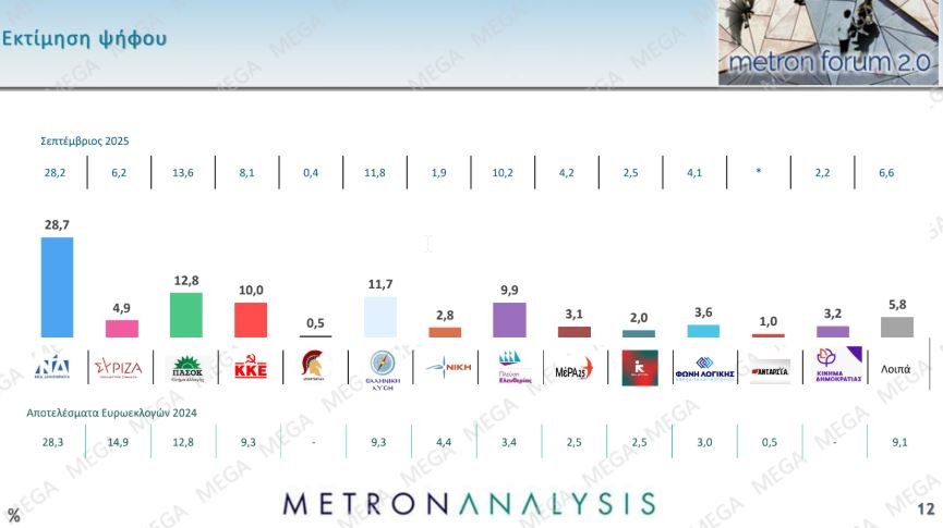 Πιο αναλυτικά, η ΝΔ συγκεντρώνει ποσοστό 28,7% έναντι 12,8% του ΠΑΣΟΚ, 11,7% της Ελληνικής Λύσης και 10% του ΚΚΕ. Η Πλεύση Ελευθερίας εμφανίζεται σε μονοψήφιο ποσοστό (9,9%).