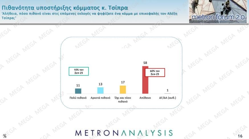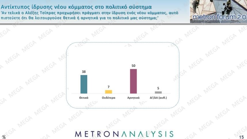 Στο ερώτημα αν θα λειτουργούσε θετικά στο πολιτικό σύστημα ένα νέο κόμμα Τσίπρα, το 38% απαντά θετικά και το 50% αρνητικά.