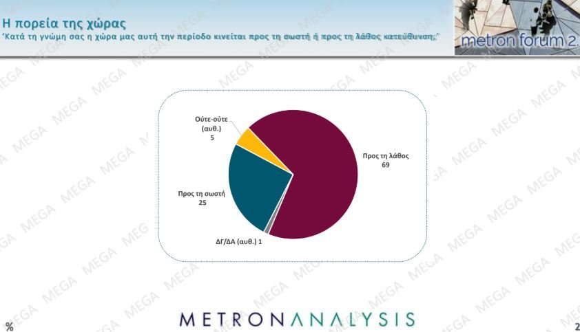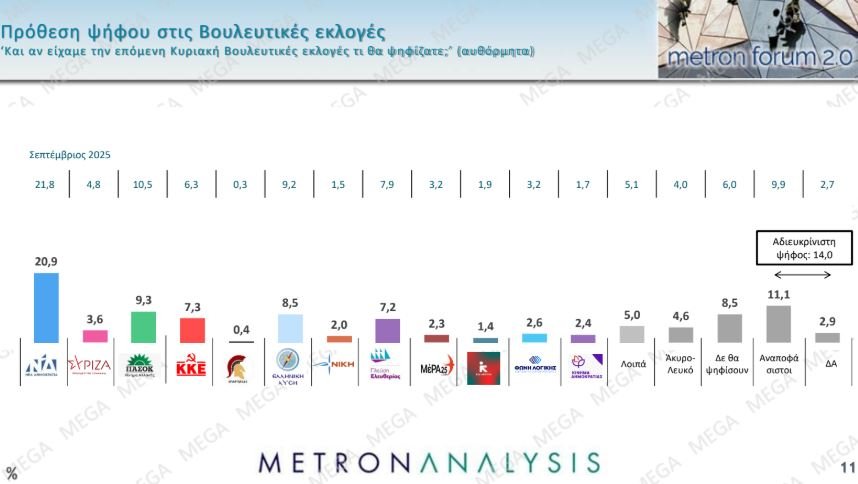 Προβάδισμα 15,9 μονάδων στην εκτίμηση ψήφου συγκεντρώνει η ΝΔ στην τελευταία δημοσκόπηση της Metron Analysis για λογαριασμό του Mega.