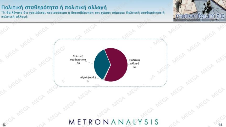 Στο ερώτημα «πολιτική αλλαγή ή σταθερότητα», ωστόσο, η «αλλαγή» συγκεντρώνει 63% έναντι 36% της σταθερότητας.