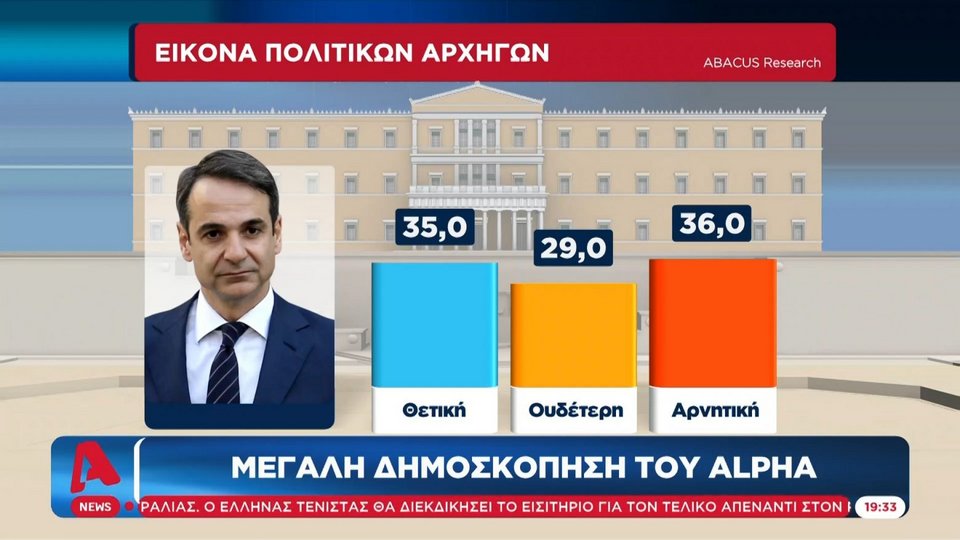 Ο πρωθυπουργός Κυριάκος Μητσοτάκης έχει 35% θετικές γνώμες, 29% ουδέτερες και 36% αρνητικές.