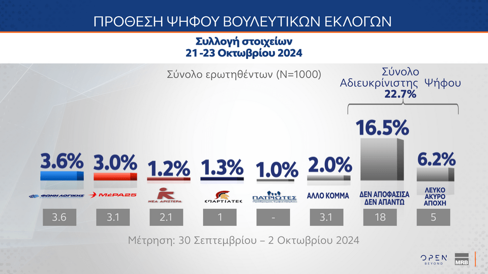 Στην πρόθεση ψήφου η ΝΔ συγκεντρώνει 21,7% και το ΠΑΣΟΚ ακολουθεί με μονοψήφια διαφορά στο 14,1%, ενώ ο ΣΥΡΙΖΑ δείχνει να καταρρέει, καθώς βρίσκεται στην πέμπτη θέση με 6,4%.