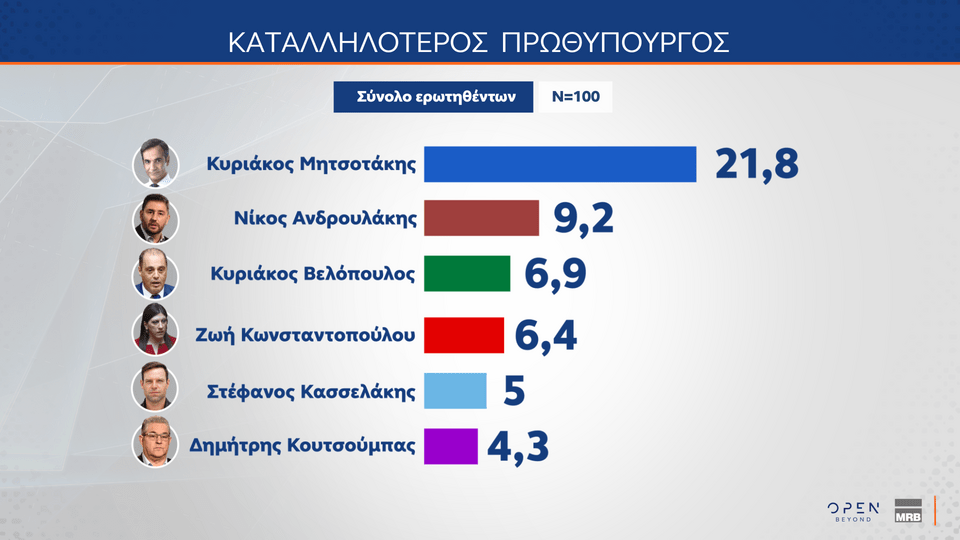 Στην ερώτηση ποιος είναι καταλληλότερος για πρωθυπουργός, ο Κυριάκος Μητσοτάκης προηγείται με 21,8% και ακολουθεί με μεγάλη διαφορά αν και εμφανώς κερδισμένος ο Νίκος Ανδρουλάκης με 9,2%.
