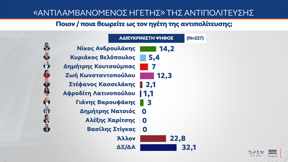 Τόσο στο σύνολο των ψηφοφόρων (26,3%) όσο και στο αδιευκρίνιστο κοινό (14,2%) ο πρόεδρος του ΠΑΣΟΚ Νίκος Ανδρουλάκης θεωρείται ο ηγέτης της αντιπολίτευσης.