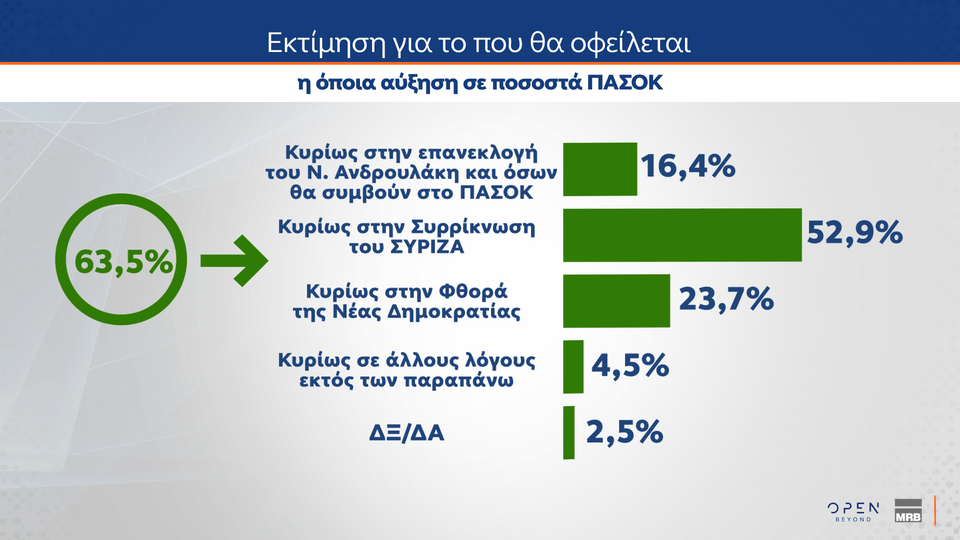 Ωστόσο, ένα στοιχείο που «θα πρέπει να δει ο κ. Ανδρουλάκης», όπως παρατήρησε ο Δ. Μαύρος, είναι το γεγονός ότι το ΠΑΣΟΚ αν δει αύξηση στα ποσοστά του αυτό θα οφείλεται κατά μείζονα λόγο (52,9%) στη συρρίκνωση του ΣΥΡΙΖΑ, στη φθορά της ΝΔ (23,7%) και πολύ λιγότερο (16,4%) στην επανεκλογή Ανδρουλάκη.