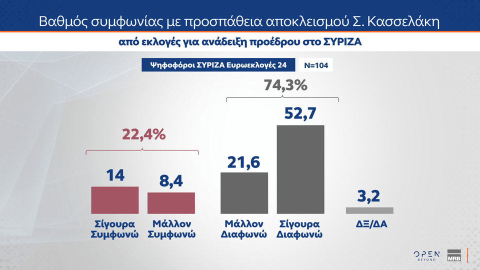 Το 74,3% των ψηφοφόρων ΣΥΡΙΖΑ στις ευρωεκλογές του 2024 διαφωνεί και μάλλον διαφωνεί με τον αποκλεισμό του Στ. Κασσελάκη από τις εκλογές για ανάδειξη προέδρου, έναντι 22,4% που συμφωνεί και μάλλον συμφωνεί.