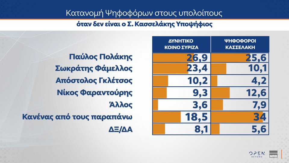 Στις εξελίξεις στον ΣΥΡΙΖΑ τώρα, ο Παύλος Πολάκης προηγείται στην κούρσα για την ηγεσία -χωρίς υποψηφιότητα του Στέφανου Κασσελάκη- με 26,9% στο δυνητικό κοινό του ΣΥΡΙΖΑ. Από κοντά με 23,4% ακολουθεί ο Σωκράτης Φάμελλος.