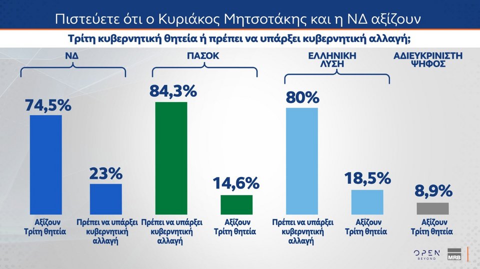Ειδικότερα, το 74,5% των ψηφοφόρων της ΝΔ επιθυμεί μια τρίτη θητεία, ενώ το 23% ζητά αλλαγή. Το 84,3% των ψηφοφόρων του ΠΑΣΟΚ εκτιμά ότι πρέπει να υπάρξει αλλαγή κυβέρνησης, ενώ το 14,6% θεωρεί ότι η ΝΔ αξίζει τρίτη θητεία. Το 80% των ψηφοφόρων της Ελληνικής Λύσης θεωρεί ότι πρέπει να υπάρξει αλλαγή, ενώ το 18,5% επιθυμεί τρίτη θητεία της ΝΔ.