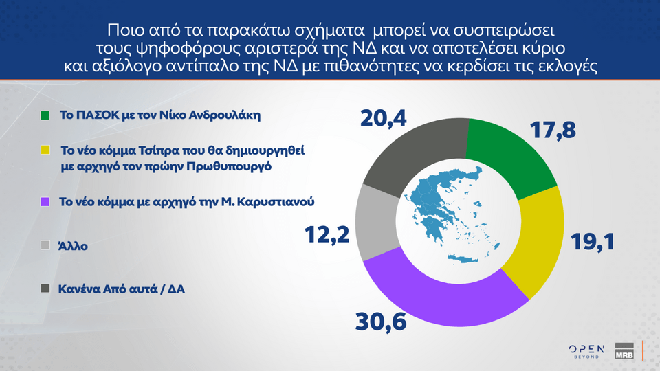 Σχετικά με τους αντιπάλους του κυβερνώντος κόμματος στις επόμενες εκλογές, το 30,6% θεωρεί ότι ένα κόμμα με αρχηγό τη Μαρία Καρυστιανού θα είχε πιθανότητες να κερδίσει τις εκλογές, ενώ το 19,1% λέει το νέο κόμμα του Αλέξη Τσίπρα.