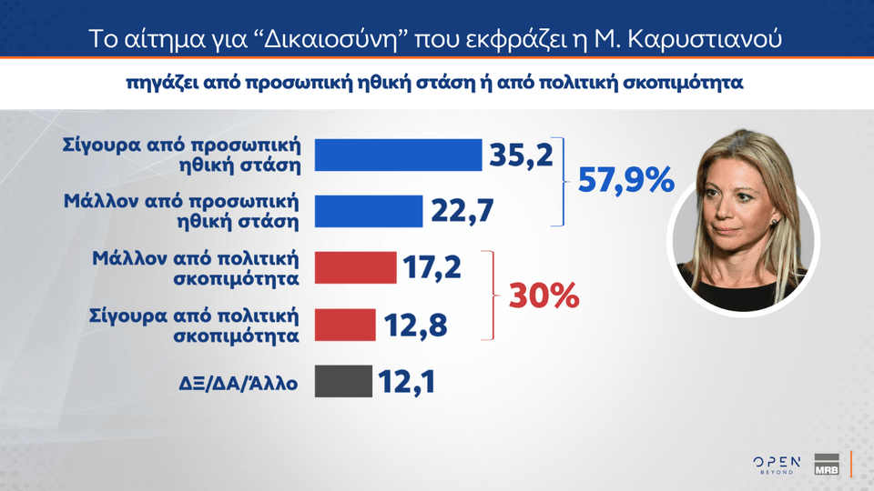 Παρόμοια είναι και η διάθεση σχετικά με το πλάνο που δηλώνει ότι έχει η Μαρία Καρυστιανού για το κόμμα που δημιουργεί, με το 49,8% να θεωρεί ότι δεν είναι ρεαλιστικό να συγκροτηθεί χωρίς ενεργούς πολιτικούς, με το 41,1% να θεωρεί ότι κάτι τέτοιο είναι ρεαλιστικό.