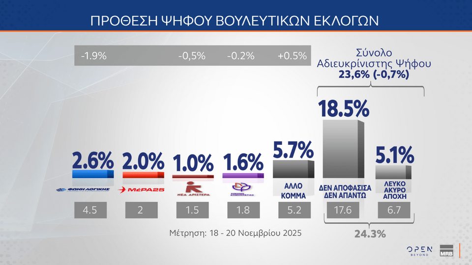Ειδικότερα, η ΝΔ έχει ποσοστό 29,2%, ακολουθεί η Πλεύση Ελευθερίας με 13,2%, το ΠΑΣΟΚ και η Ελληνική Λύση έχουν 12,7%, με το ΚΚΕ να ακολουθεί στο 7,9%. Όσον αφορά τα υπόλοιπα κόμματα, ο ΣΥΡΙΖΑ έχει 4,6%, η Φωνή Λογικής 3,4%, η Νίκη 2,9%, το ΜέΡΑ25 2,6%, το Κίνημα Δημοκρατίας 2,1% και η Νέα Αριστερά 1,3%.