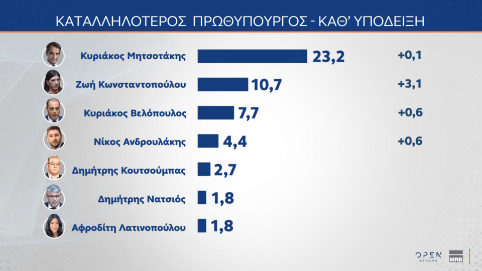 Σε ερώτημα για τον καταλληλότερο πρωθυπουργό, ο Κυριάκος Μητσοτάκης βρίσκεται στην πρώτη θέση με 23,2%, ενώ ακολουθεί η Ζωή Κωνσταντοπούλου με 10,7%.