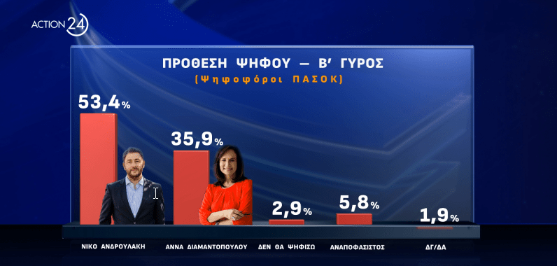 Στην πρόθεση ψήφου για τις εσωκομματικές εκλογές στο γενικό κοινό, ο Χάρης Δούκας προηγείται με 3,4 μονάδες έναντι του Νίκου Ανδρουλάκη.