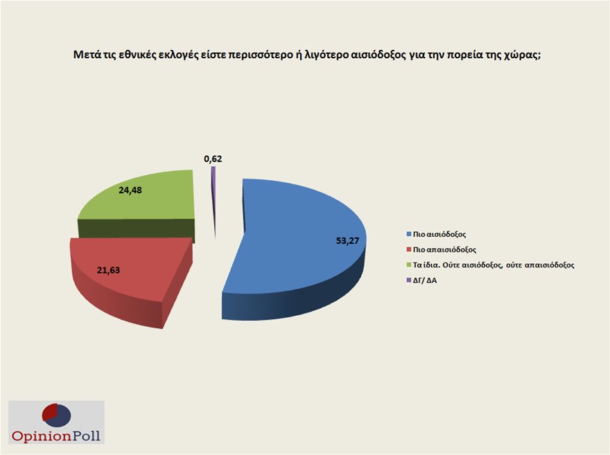 Άνοιγμα της «ψαλίδας» μεταξύ Νέας Δημοκρατίας και ΣΥΡΙΖΑ σχεδόν δύο μήνες μετά τις εθνικές εκλογές, καταγράφουν τα αποτελέσματα της πρώτης δημοσκόπησης που διενεργήθηκε μετά τις κάλπες της 7ης Ιουλίου, από την εταιρεία Opinion Poll.