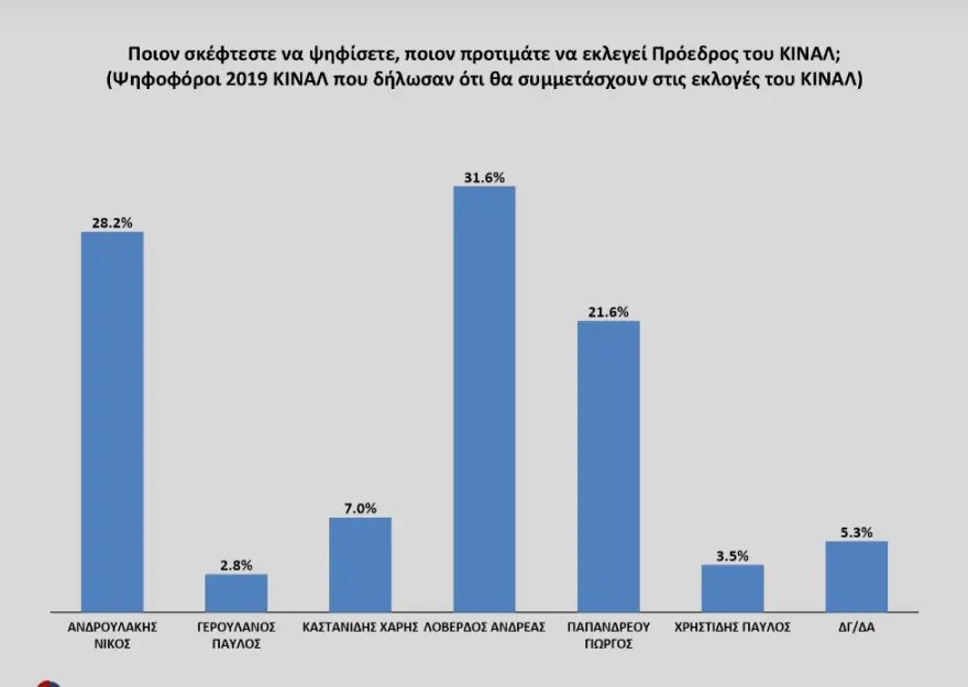 Στον πρώτο γύρο η σειρά επιλογής στο σύνολο είναι: Α. Λοβέρδος 31.7%- Ν. Ανδρουλάκης 20.9%- Γιώργος Παπανδρέου 18.8%- Χ. Καστανίδης 6.4% - Π. Γερουλάνος 5.3% , Π. Χρηστίδης 3.4%. Στο χώρο του ΚΙΝΑΛ τα ποσοστά διαμορφώνονται: Α. Λοβέρδος 31.6% - Ν. Ανδρουλάκης 28.6%- Γ.Παπανδρέου 21.6% - Χ. Καστανίδης 7% - Π. Χρηστίδης 3.5% - Π. Γερουλάνος 2.8% .
