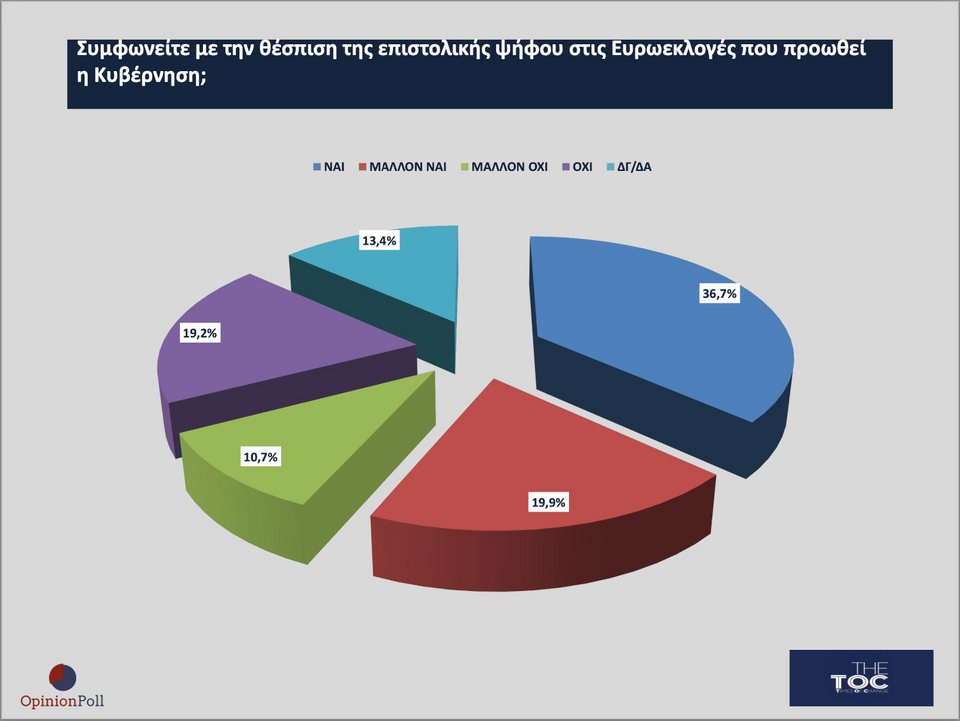 - Το 56,6% συμφωνούν με την κυβερνητική πρωτοβουλία για τη θέσπιση της επιστολικής ψήφου, ενώ αρνητικοί είναι το 29,9%.